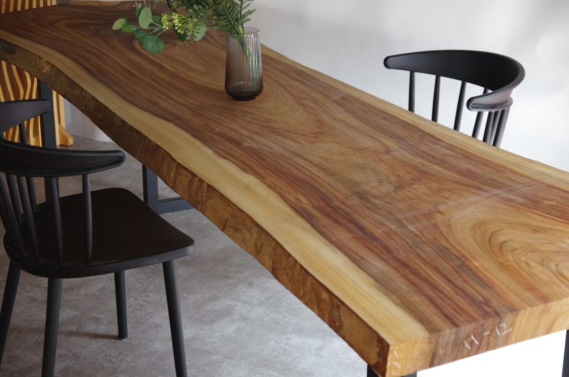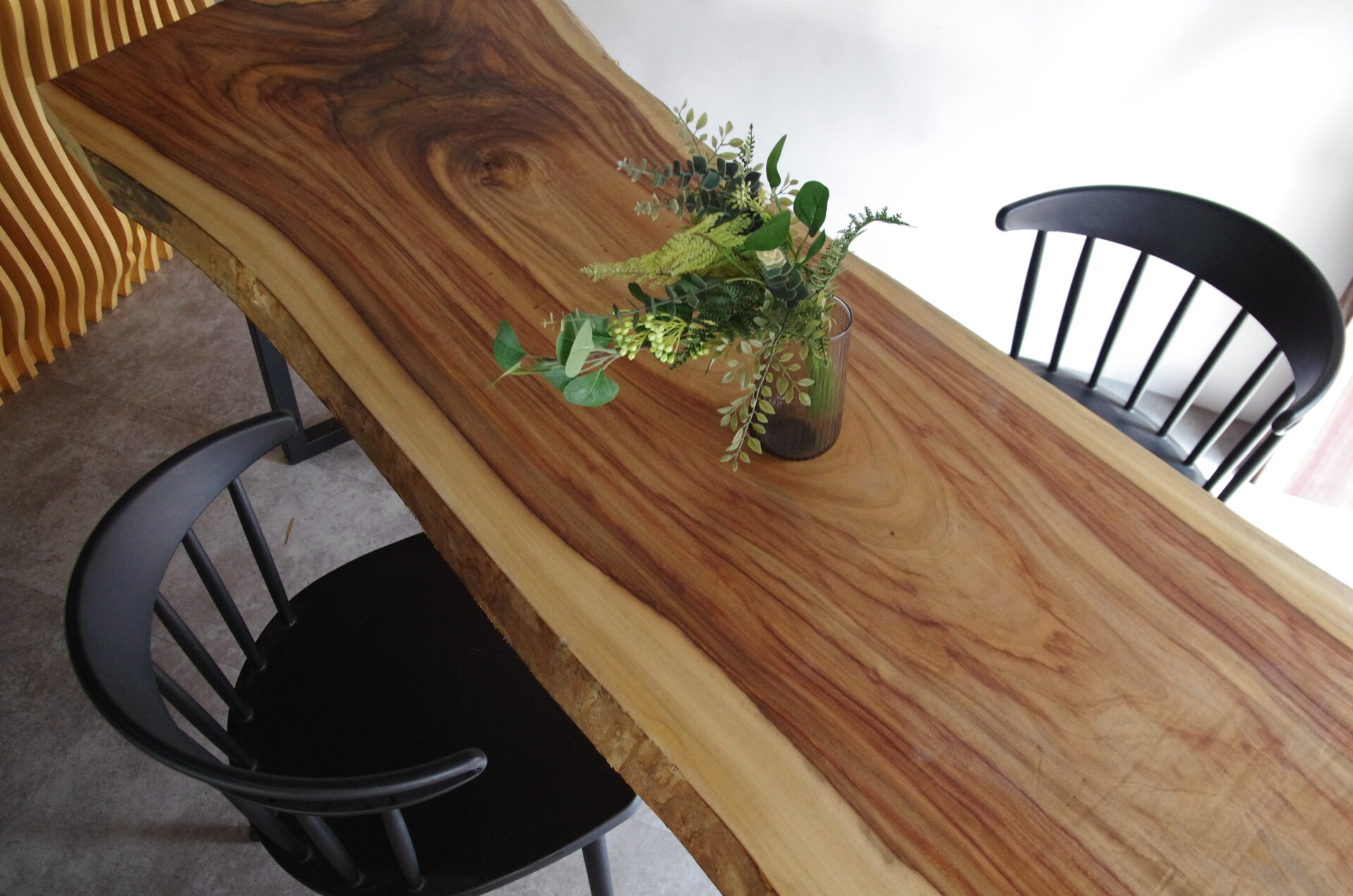 通常のクスノキよりも赤みが強い、希少な赤クスの一枚板。ダイナミックな木目が美しい一枚です。